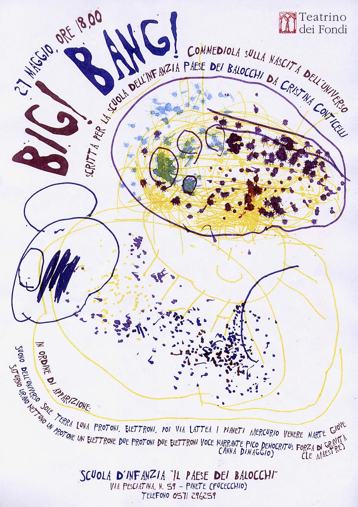 Big! Bang! laboratorio teatrale di espressione corporea e movimento scenico sull’astronomia. L’esperienza fatta alla scuola materna Il Pase dei Balocchi di Fucecchio ha visto 150 bambini dai 3 anni ai 6 anni, apprendere elementi scientifici complessi, divertendosi con la musica, le filastrocche e il movimento scenico coordinato. Leggi il testo su questo link Big! Bang!